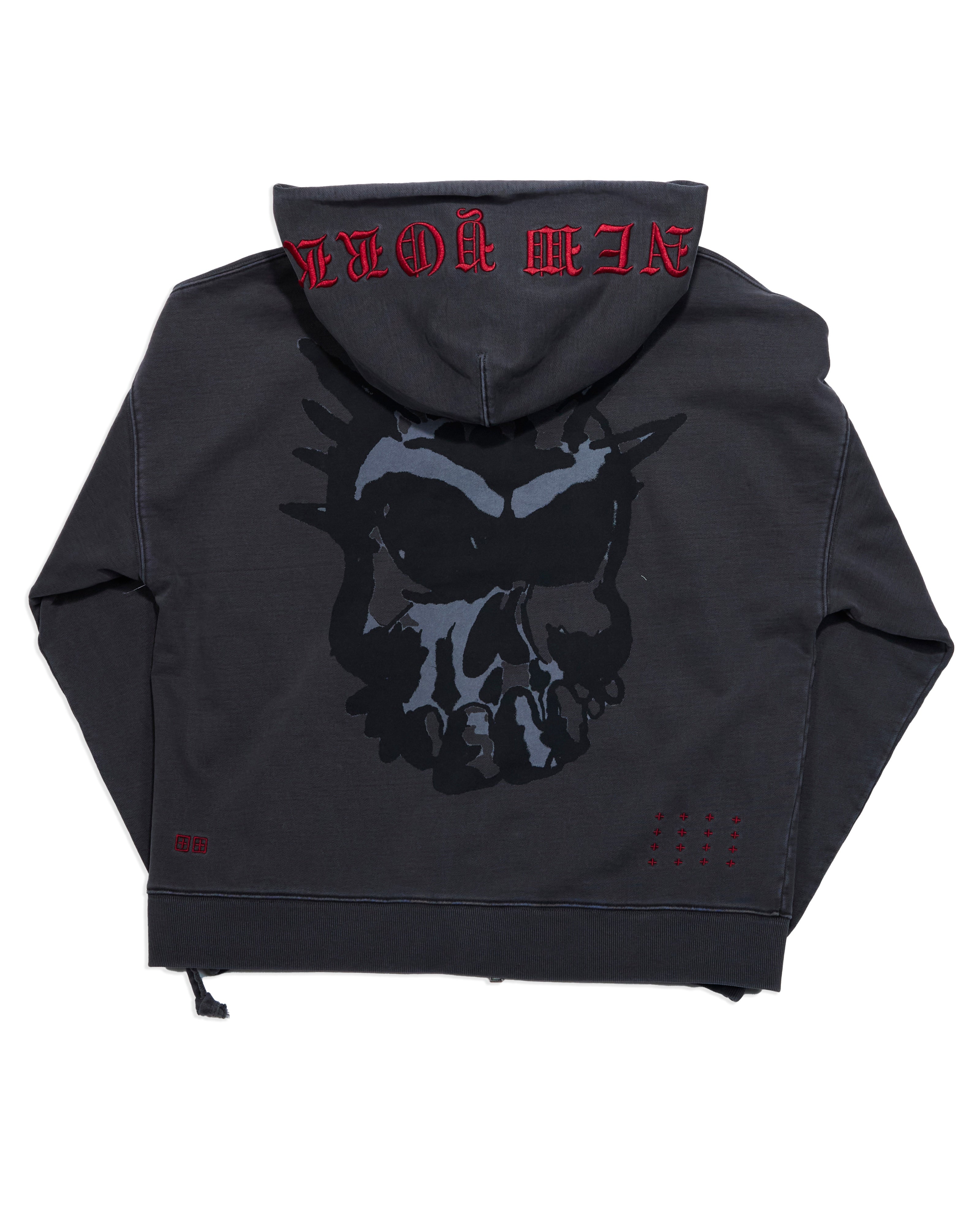 Boxy oversized fit hoodie with a single piece hood, zip through front closure, front pouch pocket and rats tail detail. Made from a loopback fleece in a garment dyed faded black with an aged wash. Featuring seasonal screen prints up the sleeve accompanied by hood embroidery, and finished with t-box and 4x4 embroidery branding.