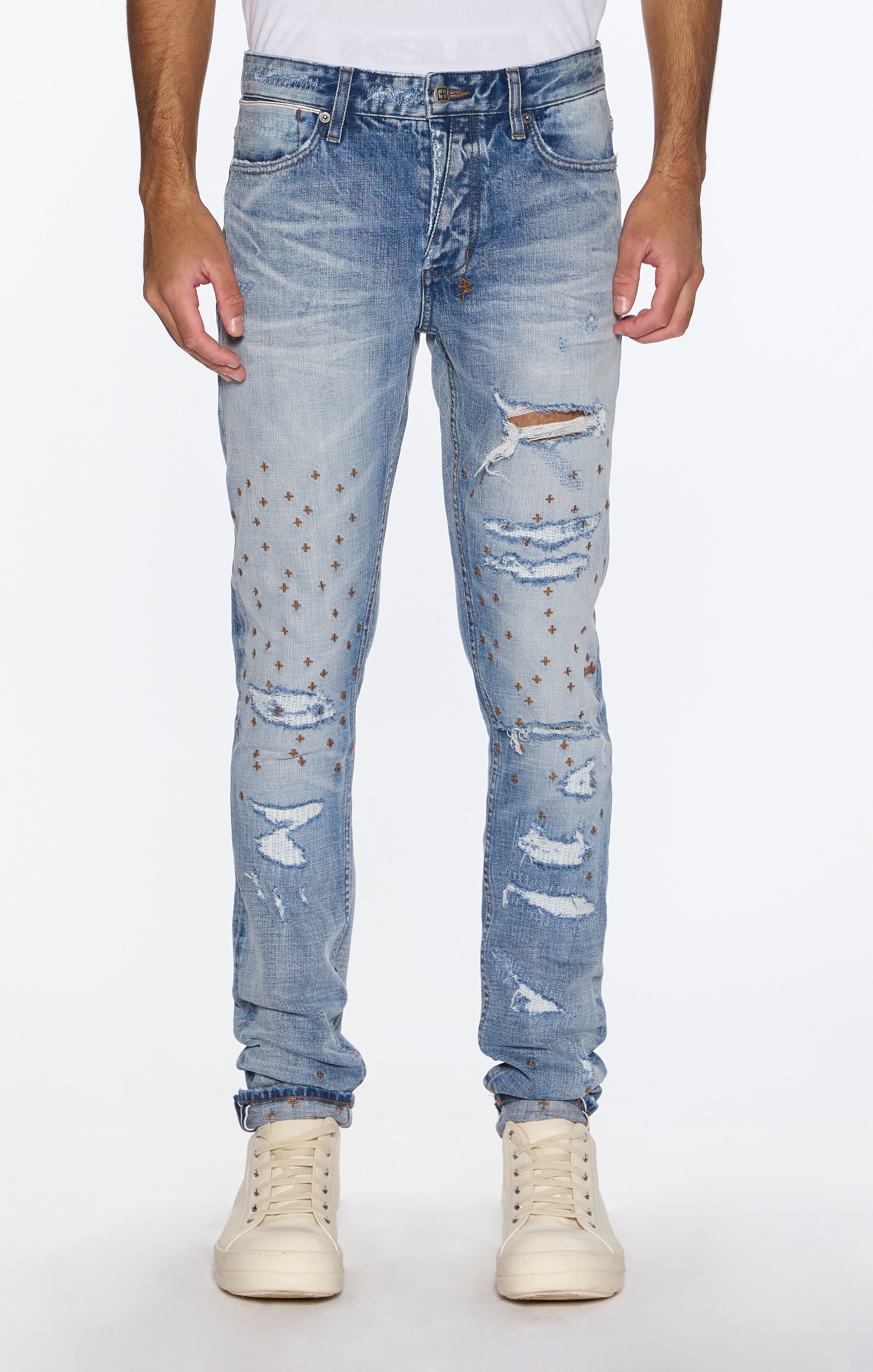 A mid rise five pocket full length skinny jean. Made from a Eurpoean indigo comfort stretch denim with vintage wash treatments replicating authentic ageing. Details include strong seam ageing around the natural wear areas, heavy repaired deconstructions with traditional repair topstitching and sporadically placed + embroideries. Finished with a contrast t-box and 4x4 embroidery, ghost patching detailing and Ksubi branded hardware.