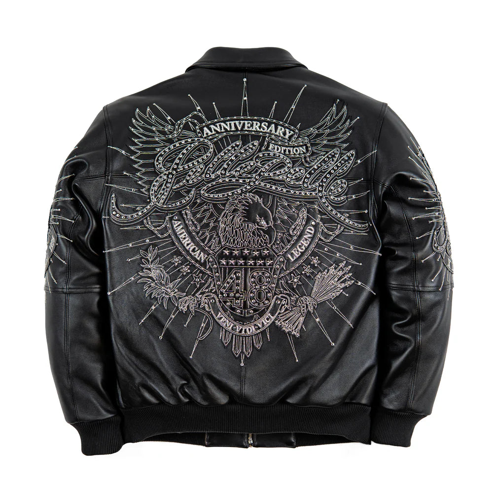 Oversized leather applique Pelle Pelle eagle graphic with metallic thread stitching and Rhinestones throughout on the back of the jacket